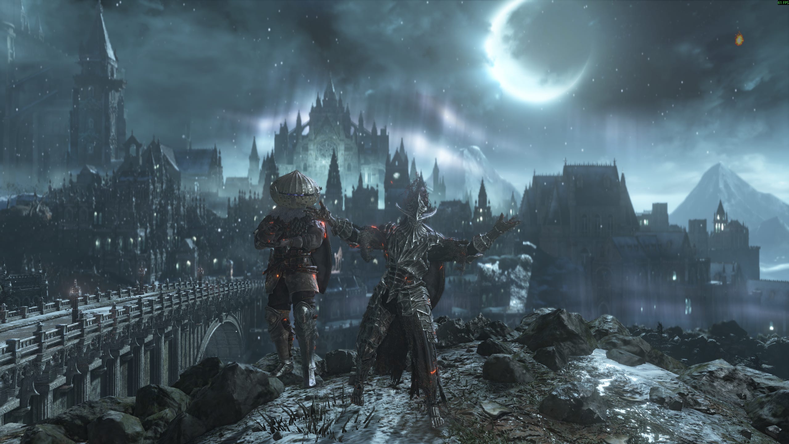Here I am with my friend: he's on the right and I'm on the left. Seeing this image reminded me of how time initially feels linear and progressive but, later, shatters into shards and splinters when you reflect on it. A night like this one, where we reached the beautiful city of Irithyll together in Dark Souls 3, was probably just a night like any other. I valued it at the time, sure, but it was another night in a series of nights.